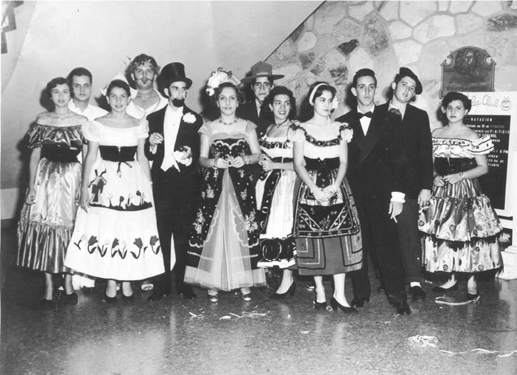Fiesta de Carnaval, 1953De izquierda a derecha: Lilliam Villavicencio, Desconocido, Susana Marquez, Rafael (La Momia) Ayala, José Rabasa, Conchita Fernandez Plana, Raúl (Zeppelín) Cosío, Laura Villavicencio, Desconocida, Nicolas (Lalito) Fernandez Plana, Miguel (Pilón) Bisbé y Teresita Marquez.