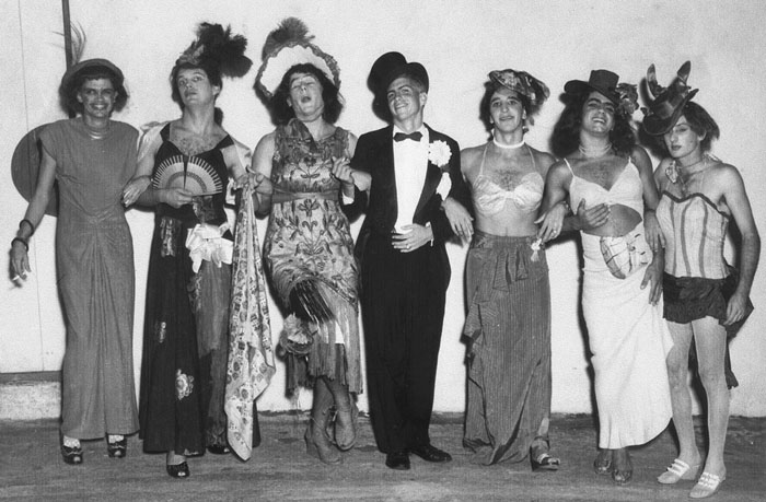 Los Mamarrachos en la Fiesta de Carnaval, circa 1956Al maestro de ceremonias, Tommy Padrón, lo rodean seis preciosas "damas" de izq. a derecha: Tony (Chiflido) Botet, Manuel (Buzzy) Nogues, Gabriel (Botella) Gomez del Rio, Jose Luis Machado, Vicente (El Loco) de la Guardia, y Roberto (Semillita) Poey.