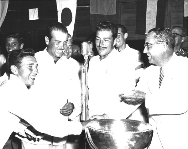 Presentación del Trofeo de Snipes, 1955El Grumete Jesús Barazal y el Capitán Jorge Mantilla reciben el trofeo del Comodoro Manuel Rasco mientras que Gonzalo Meléndez observa.